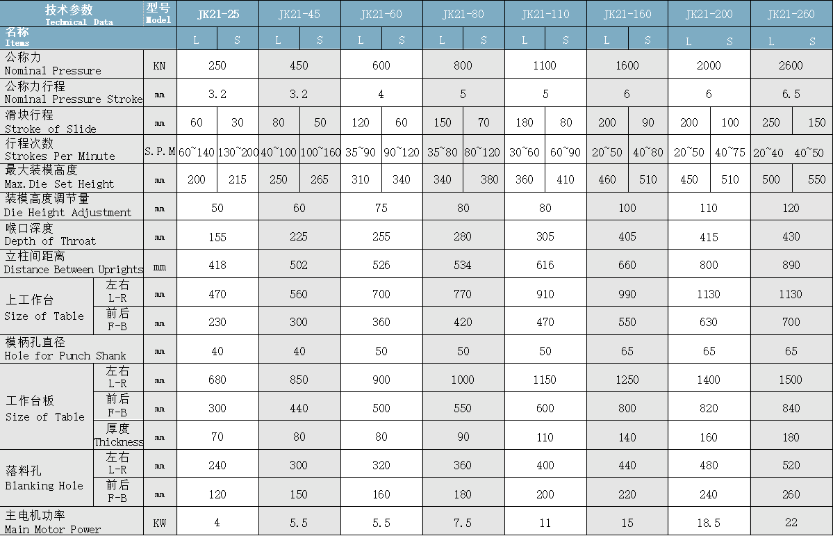 Model | JK21-25 | JK21-45 | JK21-60 | JK21-80 | JK21-110 | JK21-160 | JK21-200 | JK21-260 |