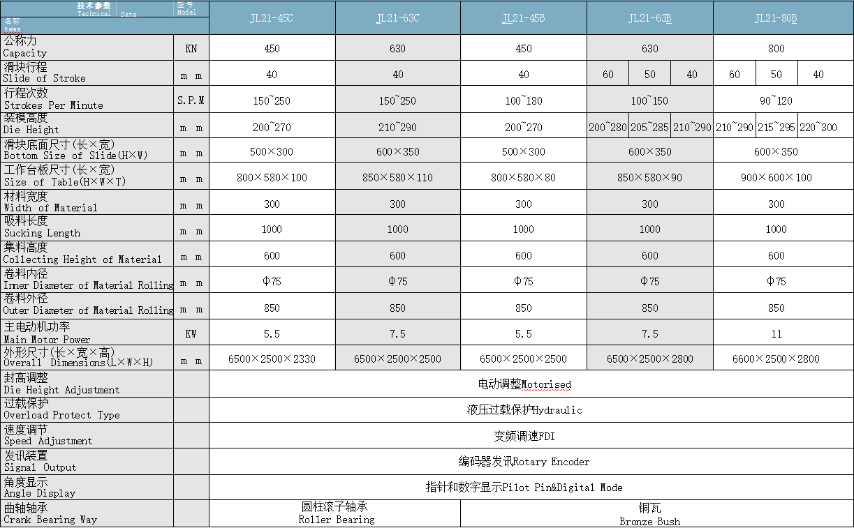 - 主机配液压过载保护及模高电动调节装置(JL21-45B除外);